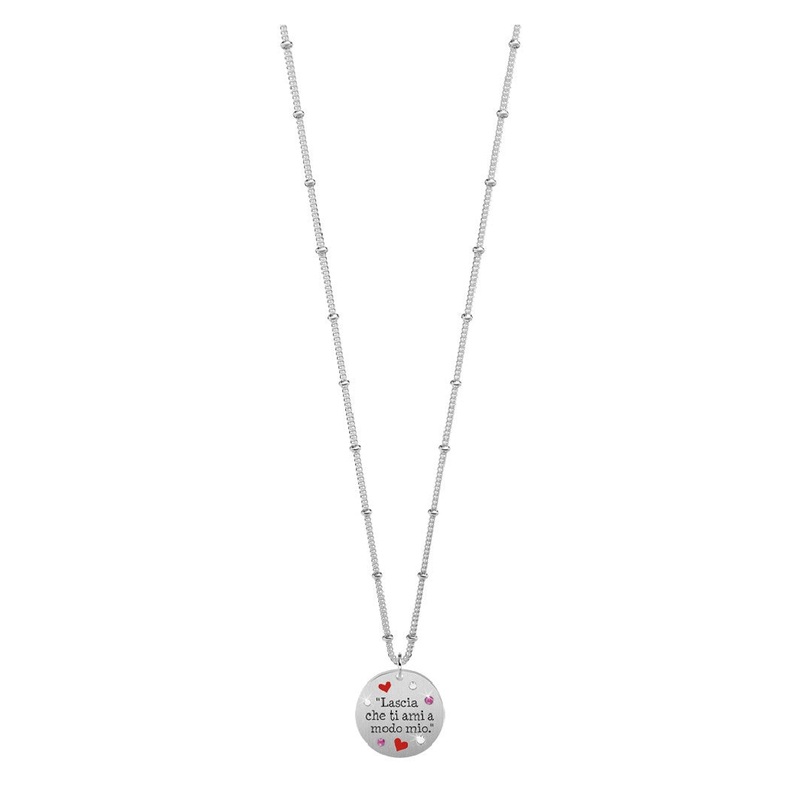 Let me love you my way. - Gustave Flaubert - Short steel necklace with round satin pendant with colored crystals and enamelled applications and groumette chain with rings. Enamel engraving, colored enamels and crystals on the pendant Carabiner closure One