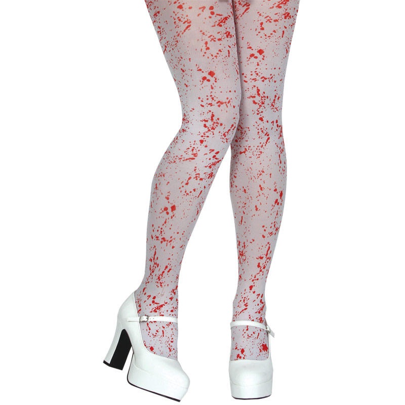 Blood Splattered Tights Costume Accessory Add a gruesome twist to your Halloween costume with our Blood Splattered Tights! These chilling tights feature realistic blood splatters on a white background, creating a spine-tingling effect that's perfect for th