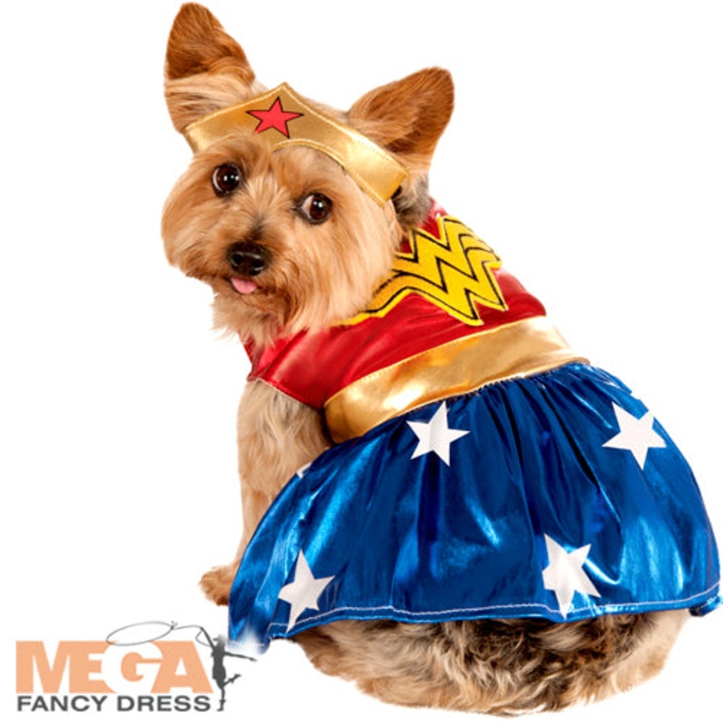 Wonder Woman Pet Dog Costume Includes Pet Dress Headpiece Size Small Neck to Tail 11" Chest 14" Medium Neck to Tail 15" Chest 17" Large Neck to Tail 22" Chest 20" XL Neck to Tail 28" Chest 24"