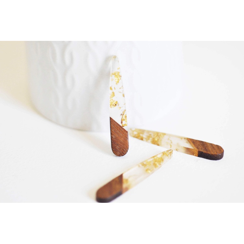 Drop pendants in wood and transparent resin and gold leaf which can make very pretty pendants or complete earrings in a geometric style.