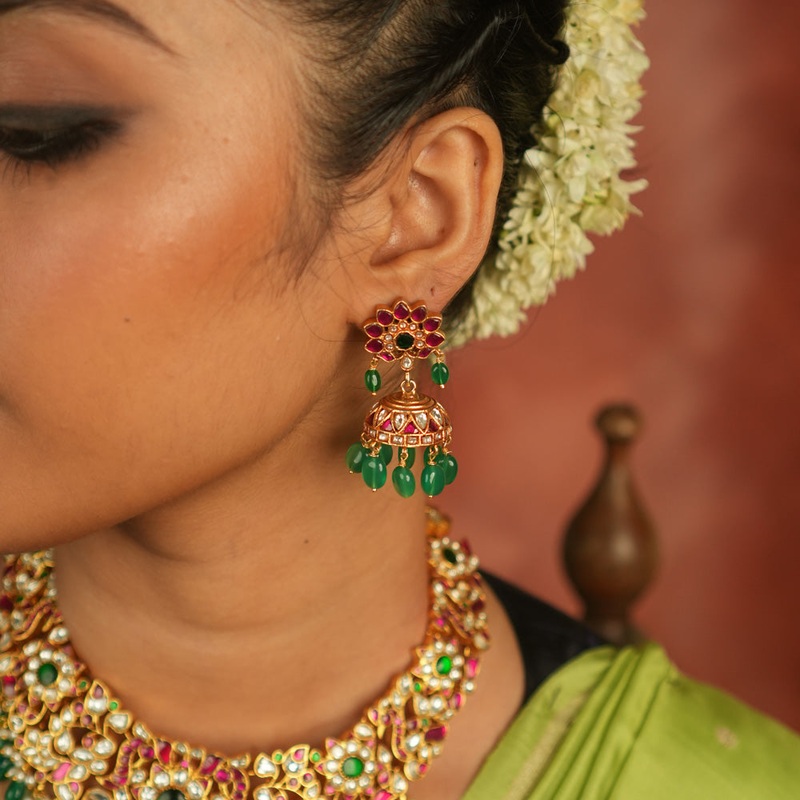 Material & Composition:Handmade 92.5 Sterling Silverand22ct GoldPlatedFastening Type:ScrewStones:White Kundan Stone, Green Beads and Pearls.Each piece is lovingly crafted for the unique you! The few asymmetrical variations sighted are because they are tend
