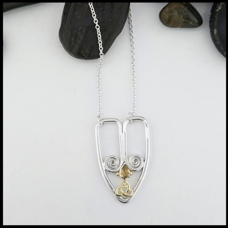 This pendant is sterling silver with a 18K yellow gold Celtic knot. This pendant is set with a yellow quartz and is attached to an 18" sterling silver cable chain.Original designs Stephen WalkerPrices subject to change.Please call or email for more informa