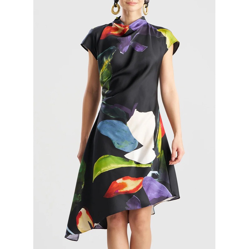 Yoru Silk Twill Black Multi Asymmetric Pleated Dress Black Multi 0