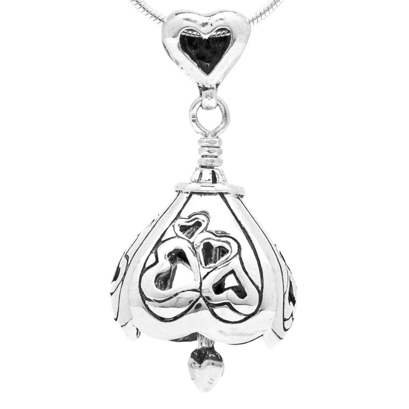 "I Love You Now, I'll Love You Forever."Handcrafted in Sterling Silver and shaped like a Hershey's Kiss, the heart design of this sterling silver You Are Loved Bell Pendant is both beautiful and captivating with cut out hearts adorning its sides and cupids