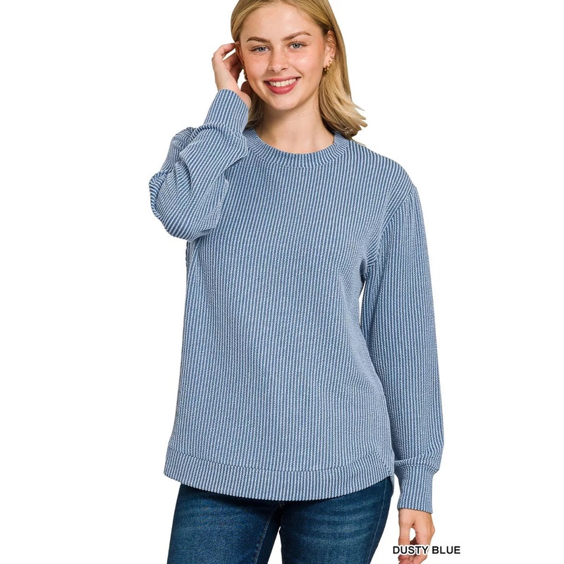 Zenana Full Size Raised Rib Round Neck Long Sleeve Top Plus Size DUSTY BLUE S