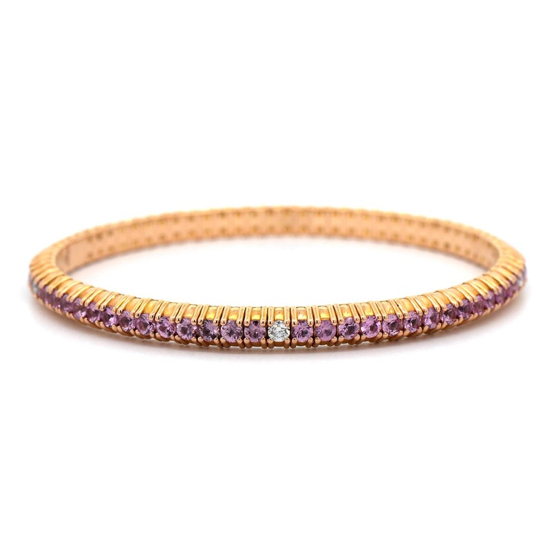 18k rose gold single row stretch bracelet with pink sapphires and scattered diamonds.